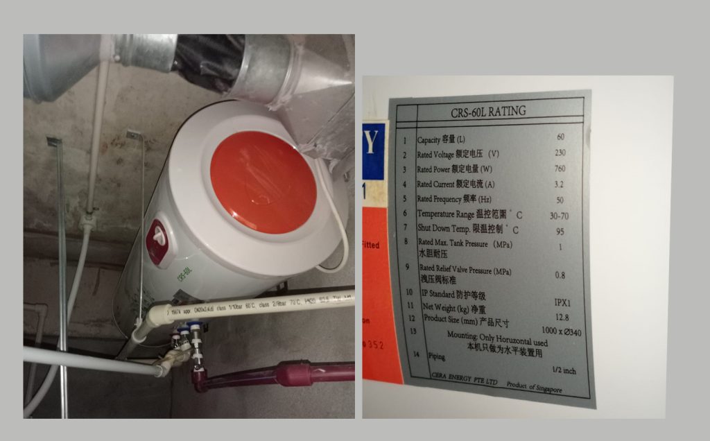 The Aging Cera Water Heater CRS-60L was replaced. We Installed a new Joven JSH35, ensuring a safe and reliable hot water heater system. The replacement of the Cera Water Heater was completed with all necessary safety upgrades, and a PUB Certificate was issued for full compliance.