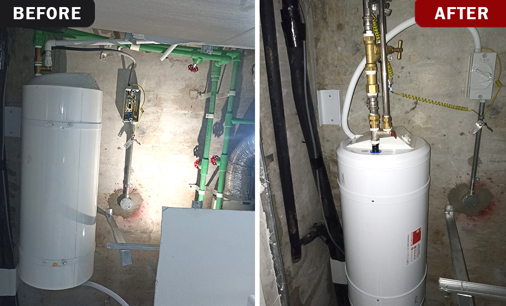 The existing Ariston PRO R S 56SHE storage water heater, installed above the ceiling, had reached the end of its service life. Age-related issues such as reduced heating efficiency and risk of leaks made a safe, compliant replacement necessary to restore reliable hot water supply.